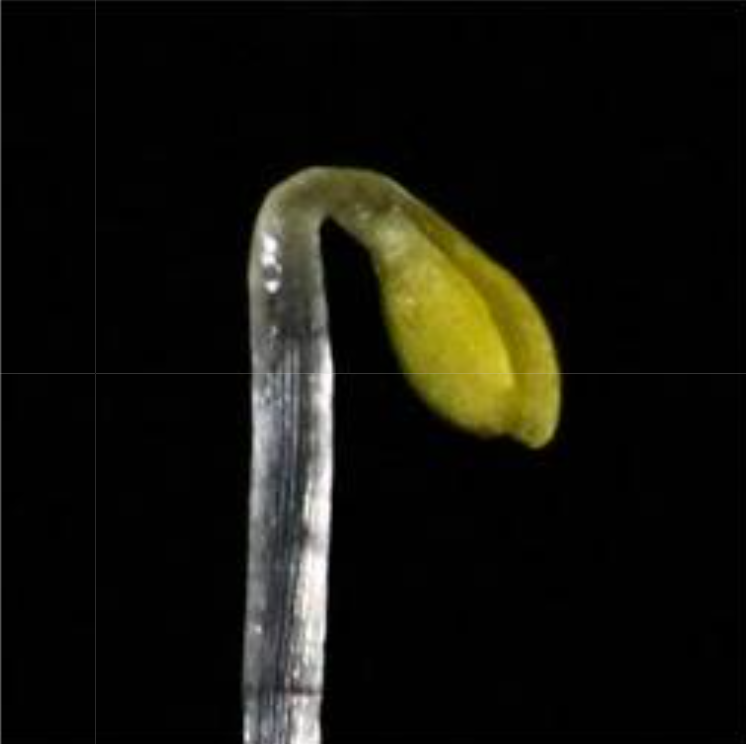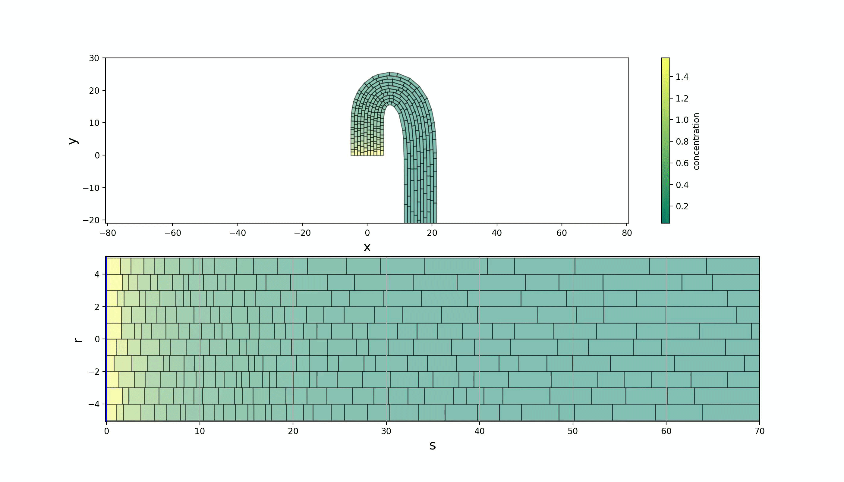 Specifically, we looked at emulating the Shoot Apical Meristem (SAM) and the apical hook as shown in Figure 1. We did this by performing a map between Lagrangian, curvilinear and Eulerian coordinate systems. A parabolic map was used to model the SAM and is given by \(\begin{equation} \begin{split} s &\mapsto x = sr \\ r &\mapsto y = \frac{1}{2}(r^2 - s^2) \,, \label{ODE} \end{split} \end{equation}\) where $(s,r)$ span the curvilinear space and $(x,y)$ span the Eulerian space. The apical hook required the more complicated transformation \(\begin{equation} \begin{split} \theta(s) &= \int\limits_0^s d\tilde{s} \, \kappa(\tilde{s}) \\ x(s,r) &= \int\limits_0^s d\tilde{s} \,\sin(\theta(\tilde{s})) + r\cos(\theta(s)) \\ y(s,r) &= \int\limits_0^s d\tilde{s} \, \cos(\theta(\tilde{s})) - r\sin(\theta(s)) \end{split} \end{equation}\) where $\kappa=\kappa(\tilde{s})$ is the curvature distribution–we used a gamma distribution.
